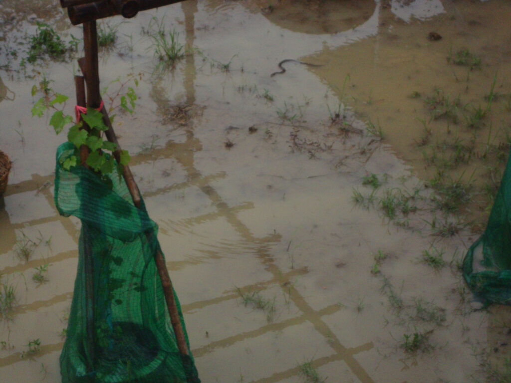 Die Drainagen habe ich bereits erstellt, nur ist das Problemchen, dass das Wasserniveau der Reisfelder nebenan nur so um die 10cm unterhalb unserem Erdboden im Garten liegen. Somit fliesst halt nur wenig Wasser wirklich ab. Heute habe ich jedefalls wieder einen Frischwasserkrebs entdeckt, welcher die Strasse runter krabbelte.
