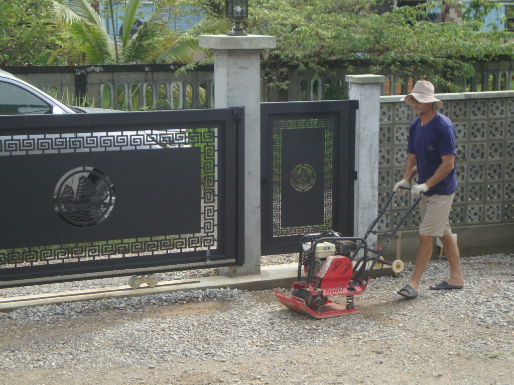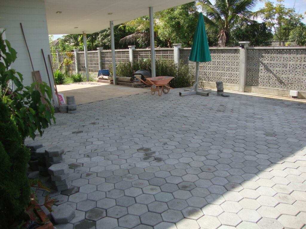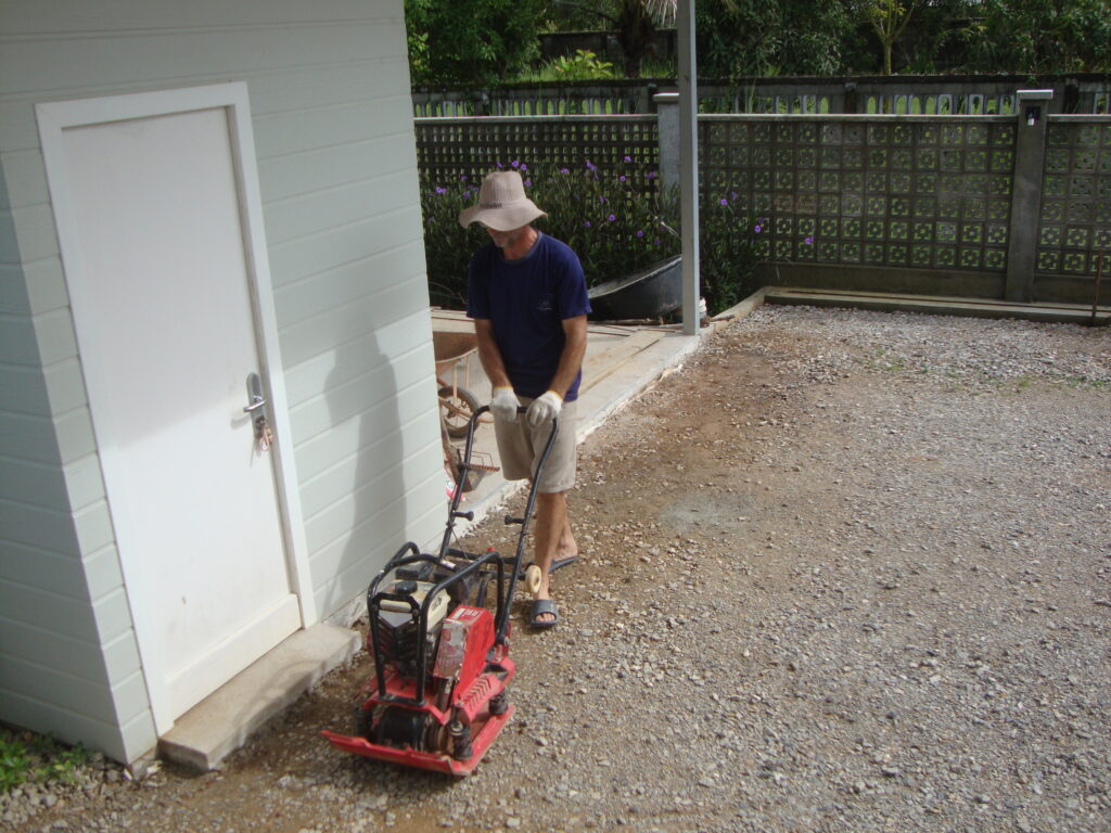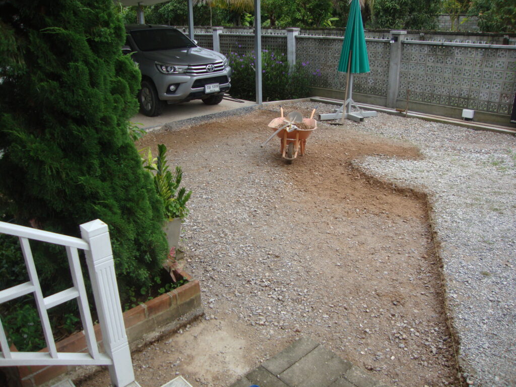 Zuerst musste die obere Schicht der Schottersteine abgetragen und seitliche Begrenzungen betoniert werden. Dummerweise haben dann noch das Wetter (Monsunregen) und Lieferverzögerungen zu Arbeitsunterbrüchen geführt, trotzdem konnten wir die Arbeiten schlussendlich abschliessen.