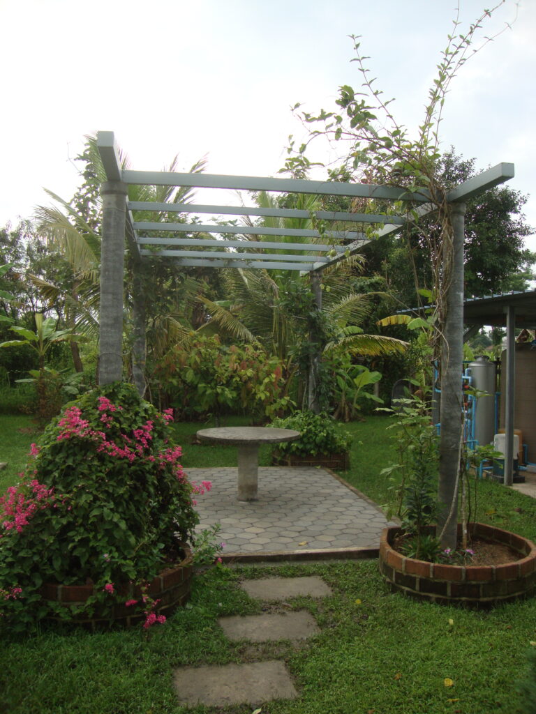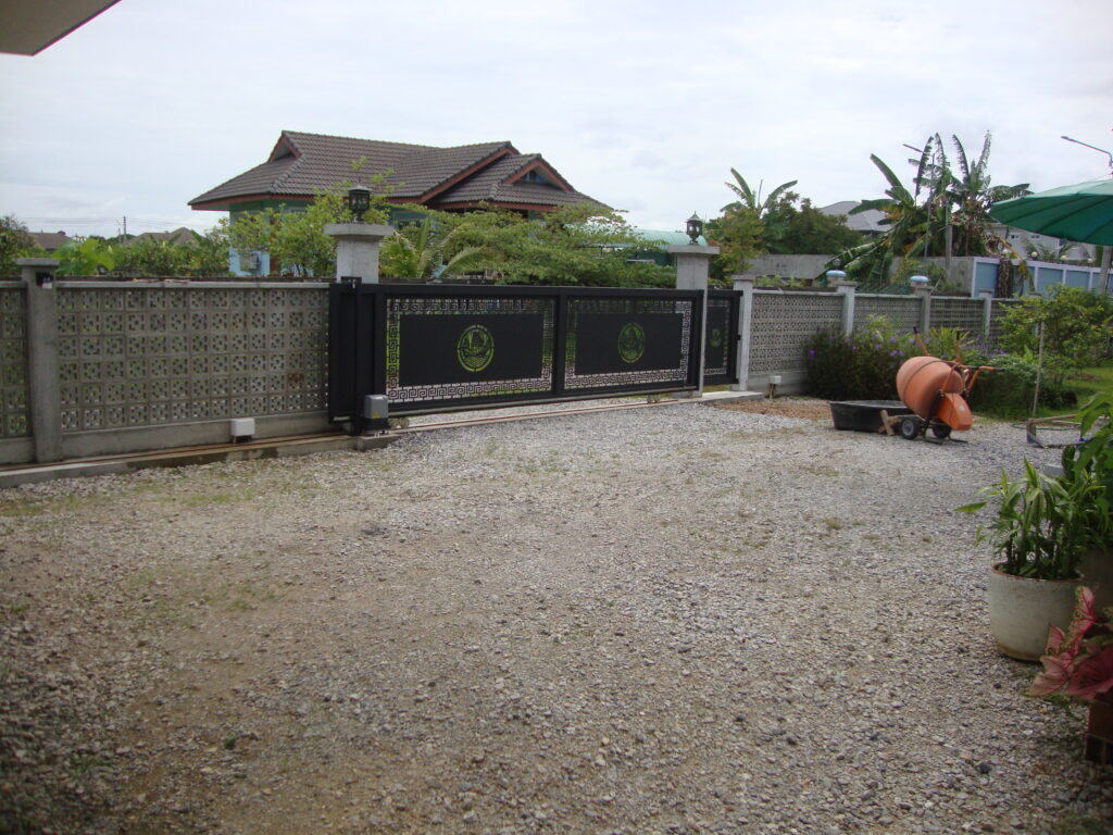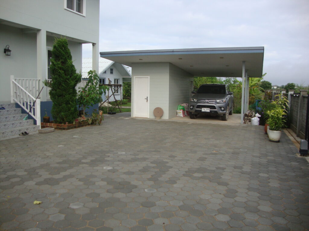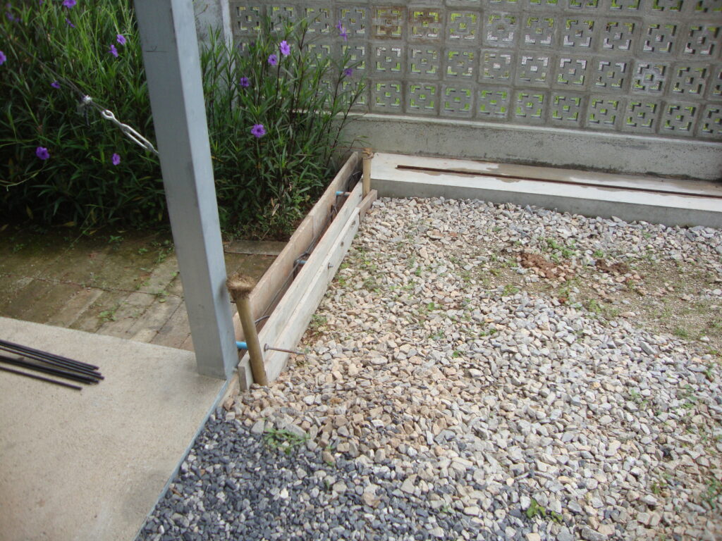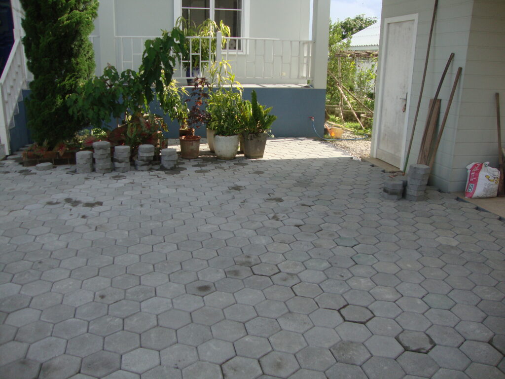 Zuerst musste die obere Schicht der Schottersteine abgetragen und seitliche Begrenzungen betoniert werden. Dummerweise haben dann noch das Wetter (Monsunregen) und Lieferverzögerungen zu Arbeitsunterbrüchen geführt, trotzdem konnten wir die Arbeiten schlussendlich abschliessen.